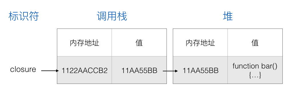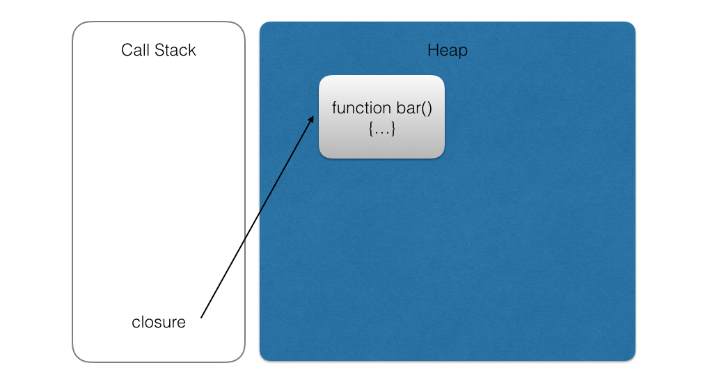 3、bar 函数被作为返回值,赋值给了 closure 变量,此时 bar 保存在堆中,由于 bar 被引用中,所以不会被垃圾回收(GC)销毁: